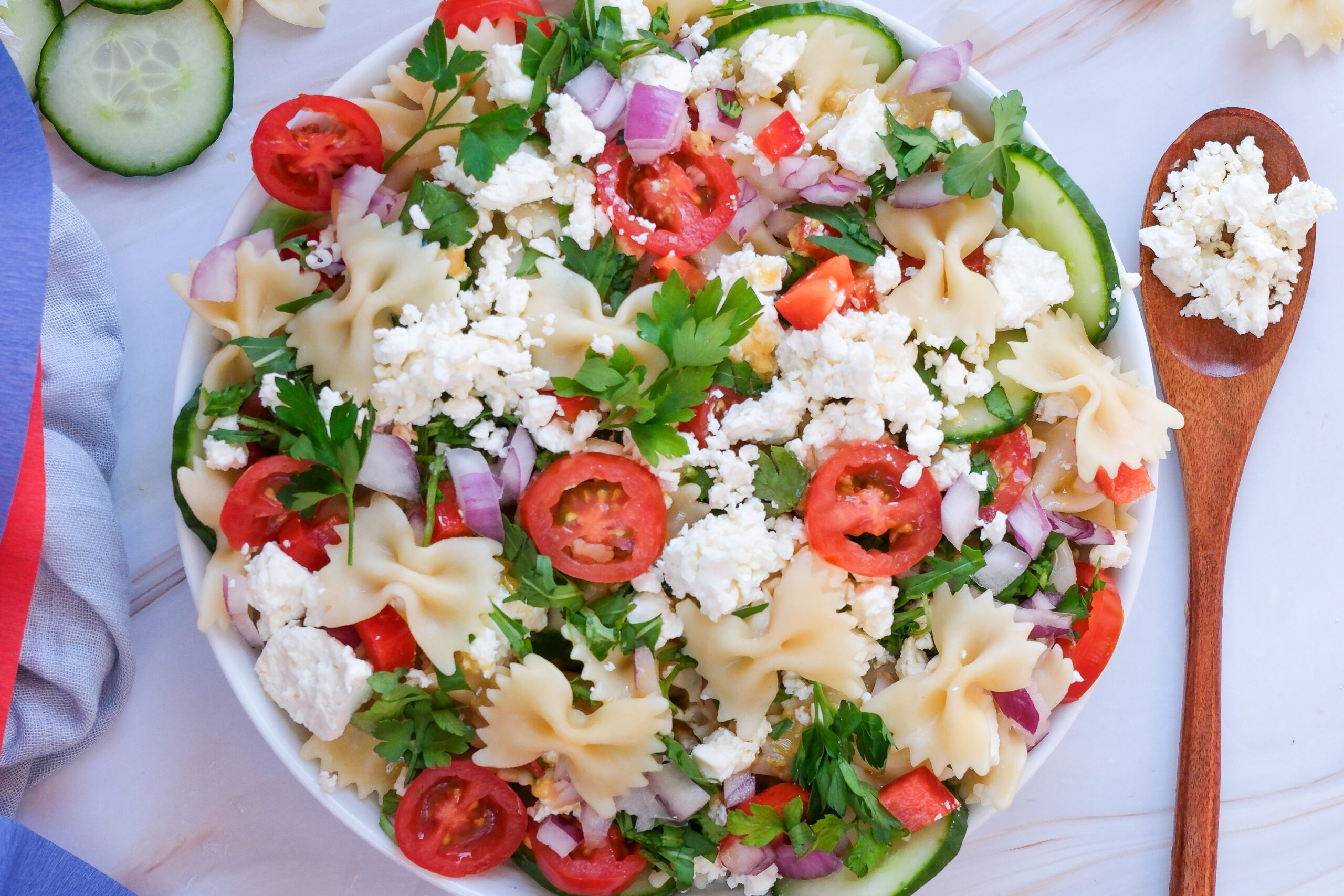 - In a large mixing bowl, combine the cooked and cooled pasta, chopped vegetables, feta cheese, and chopped parsley.